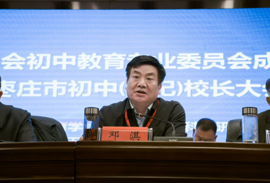 邓淇在讲话中首先祝贺枣庄市教育学会初中教育专业委员会和初中教育专家指导委员会成立。他说,教育是国之大计、党之大计。它承载着民族的希望与未来,寄托着亿万家庭的期盼与梦想。初中教育作为基础教育的重要组成部分,在教育体系中占据着承上启下的关键地位。初中教育专业委员会和初中教育专家指导委员会的成立,标志着市教育学会与市教科院以及区(市)教科研机构资源得到了有效整合,形成了枣庄市高水平教育智库平台,为促进枣庄市初中教育高质量发展奠定了组织基础。他要求全市初中学校校长,弘扬教育家精神,以核心素养培养为核心,聚焦课程改革,坚守教育初心,把握育人方向;深化教学改革,提高教育质量;加强家校合作,形成育人合力;推进信息化建设,拓宽教育视野;强化教育治理,保障教育公平,全方位推进教育强国建设。